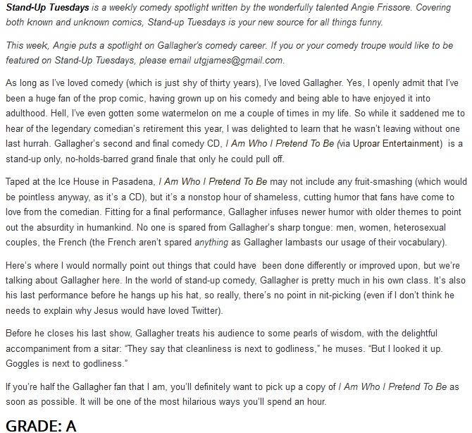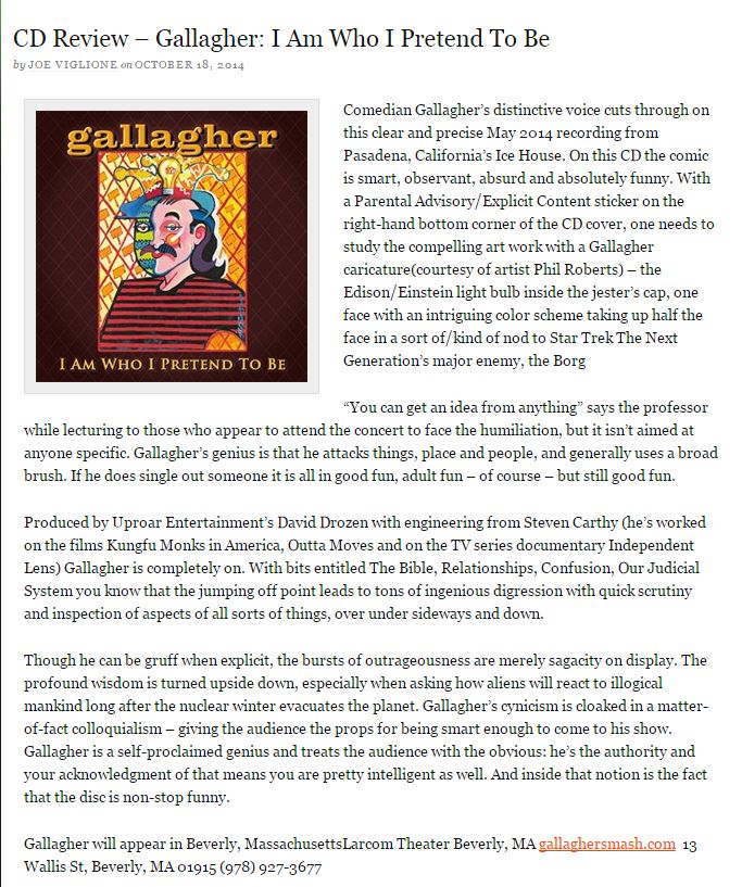 Gallagher has led an extraordinary life and a spectacular career. He has a loyal fanbase and he rewards them every chance he gets. “I Am Who I Pretend To Be” is the culmination of his life experience viewed through his own unique perspective. Gallagher on Gallagher. Gallagher on The World. Truly he is unlike anyone else.